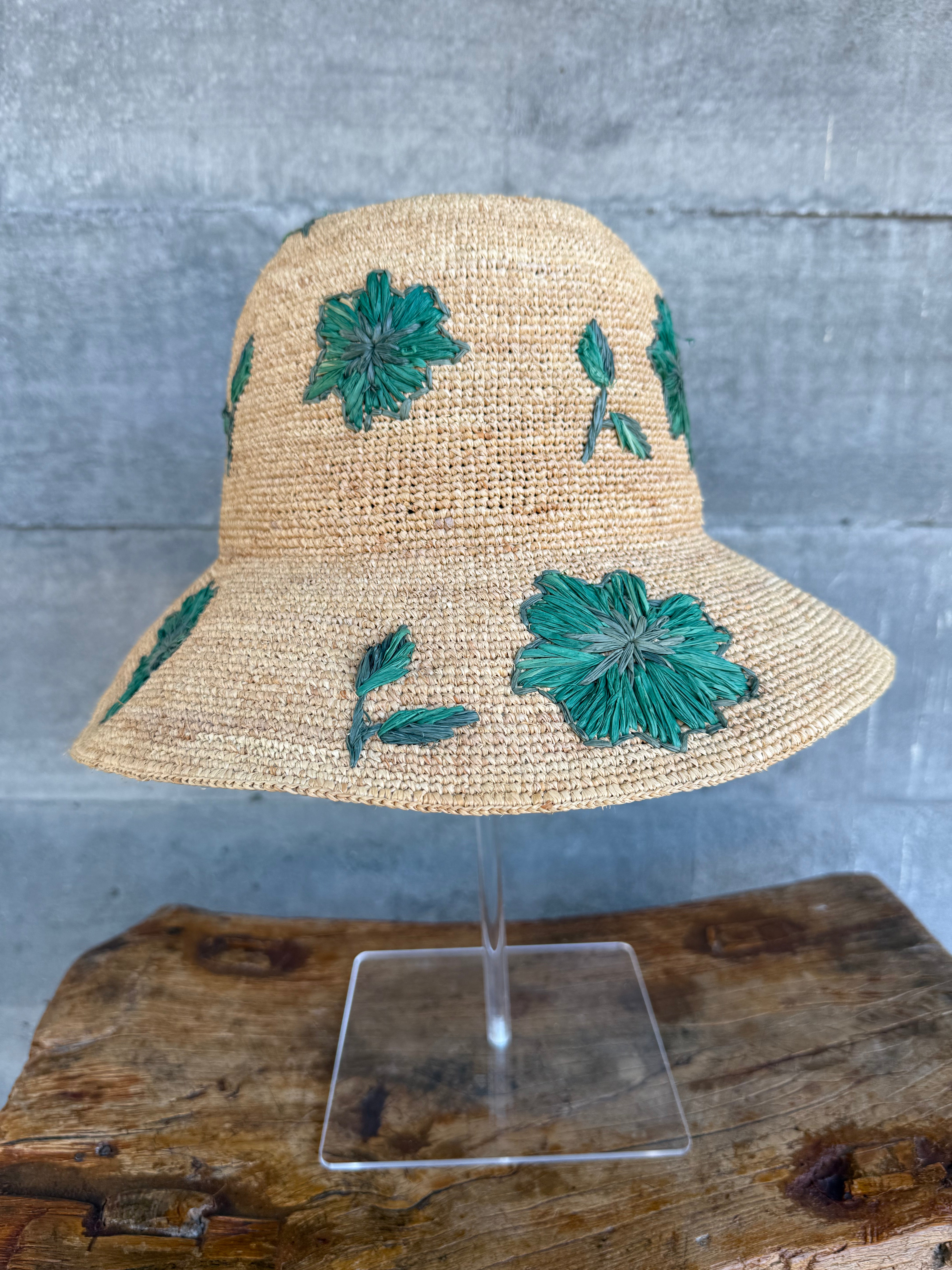 Natural Raffia Sunhat with Needlework Flower Green