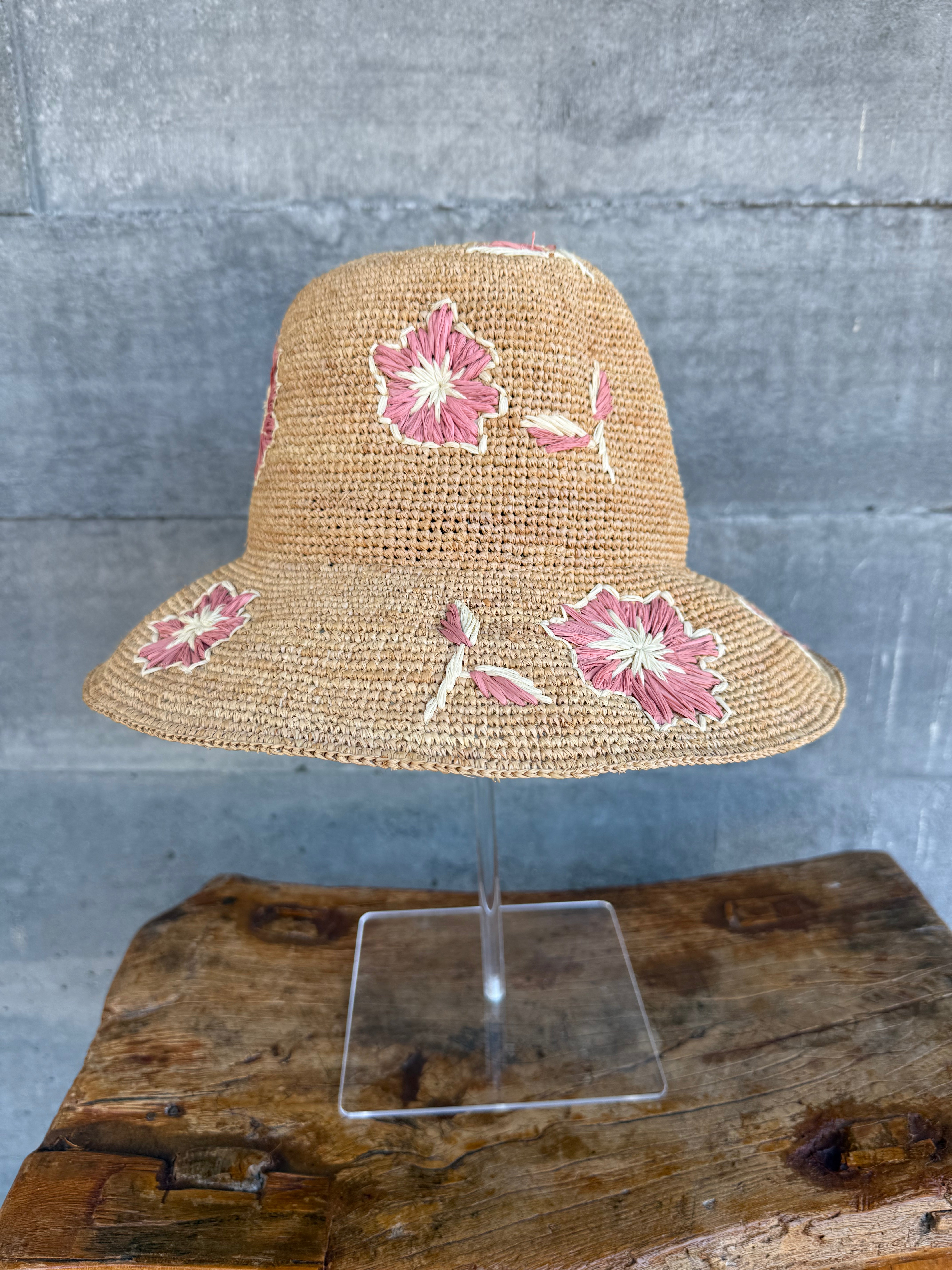 Natural Raffia Sunhat with Needlework Flower Pink